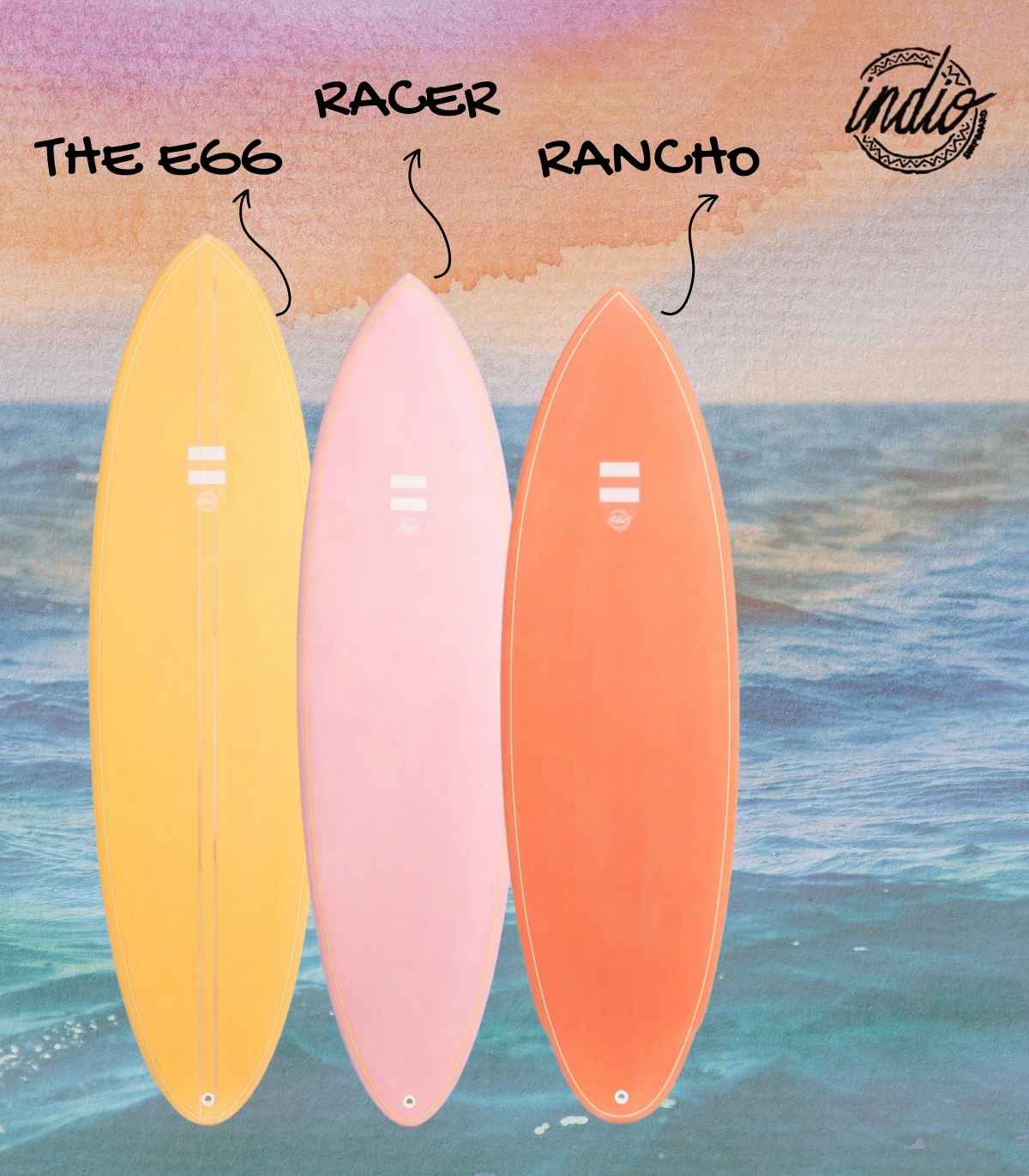 Dentro de la gama Indio Endurance, encontrarás tres modelos diseñados para distintos momentos del camino de progresión: The Egg, Racer y Rancho. Todos están fabricados en epoxy, con sistema de quillas Futures y acabados resistentes, pero cada uno ofrece sensaciones distintas según tu nivel y estilo de surf.